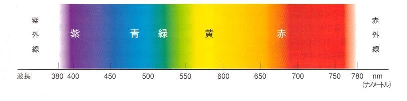上記の画像は可視光線をそれぞれ分類すると、光の波長の長さは色によって分類できます。