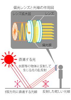 ◎この働きにより、地面や水面(雪面)で起こる太陽光の反射(ぎらつき)を 大きくカットできます。